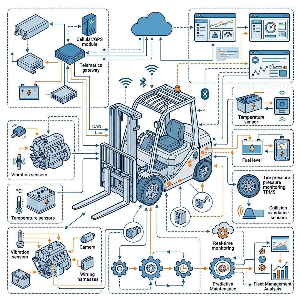 Das hoch technisierte Telematik-Retrofit bei industriellen älteren Flurförderzeugen umfasst auf dem Weltmarkt die, tiefgreifende technische und plattformunabhängige nachträgliche Aufrüstung von analogen oder semi-digitalen tonnenschweren Bestands-Gabelstaplern mittels extern montierter IoT-Steuergeräte (Internet of Things), hochsensibler elektronischer 3-Achsen Stoß-Sensoren (Gyroskopen) und autarker RFID-Zugangsterminals am Cockpit. Es wandelt den toten und Gebraucht-Mast ohne jeden drastischen mechanischen Rahmen-Eingriff zielsicher in ein voll vernetztes, komplett in Echtzeit überwachtes digitales B2B-Informations-Hub für moderne ERP-Lager-Systeme der Logistik-Neuzeit um.